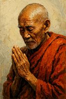 Gebed in stilte (schilderij oude monnik rood gewaad sereniteit rust wijsheid) van Natalie Bruns