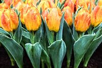 Een schilderachtig beeld van een groep geel rode tulpen.