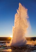 Geiser uitbarsting te IJsland met een zonsopkomst op de achtergrond.