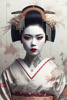 AI gegenereerd beeld van een in originele kledij en haarjuwelen getooide Geisha in waterverf.