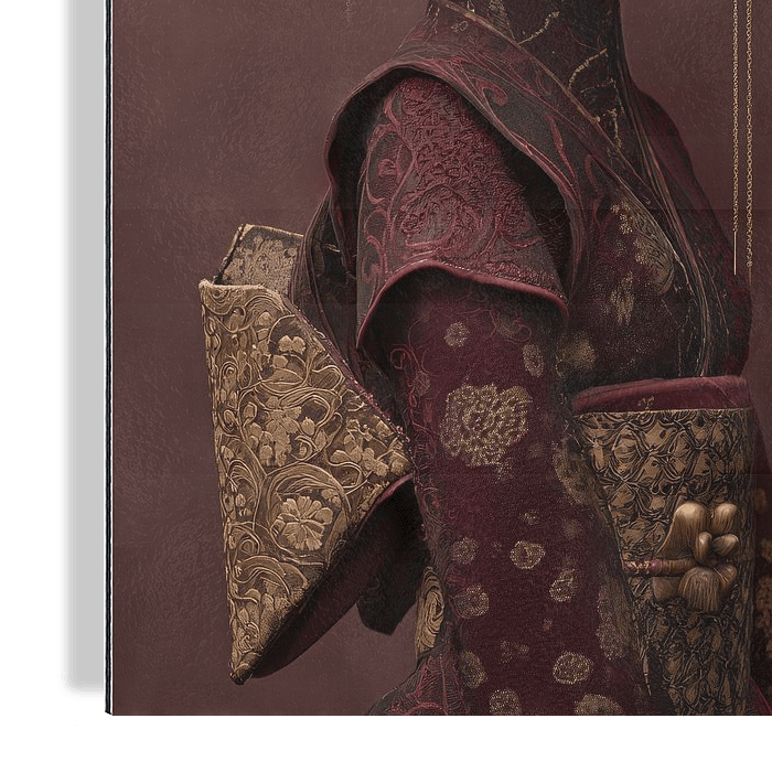 Portret van een Geisha in voornamelijk bordeauxrood en goud tinten
