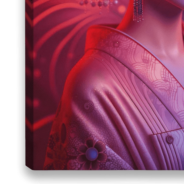 Dit betoverende portret in moderne kunststijl nodigt de toeschouwer uit tot een wereld waarin schoonheid en mysterie elkaar in evenwicht houden. Het kunstwerk toont een vrouwelijk figuur met een bijna onwerkelijke sereniteit: haar porseleinachtige huid licht op tegen een explosie van kleur, alsof ze zelf het stiltepunt vormt in een…