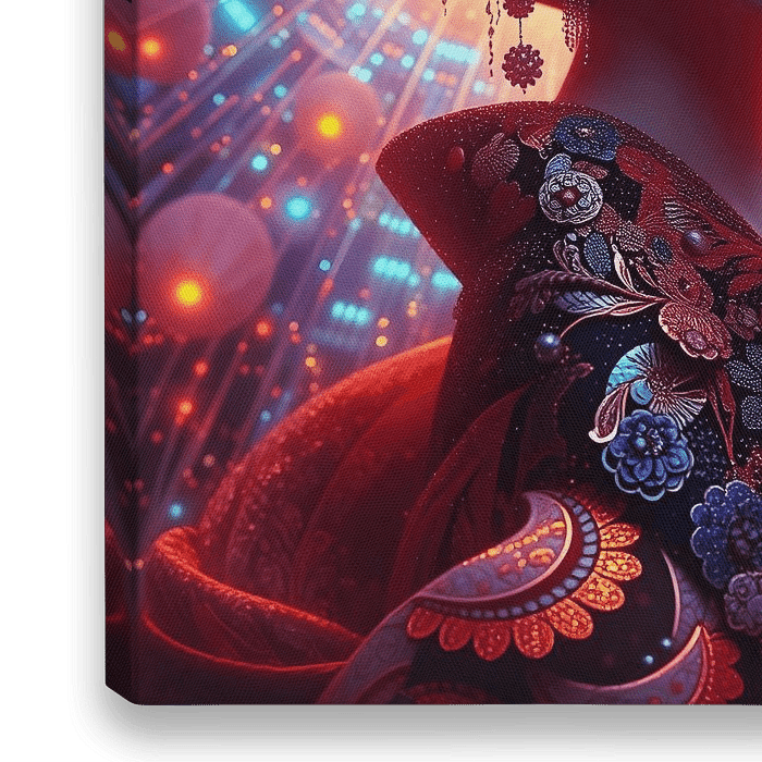 Dit betoverende portret in moderne kunststijl nodigt de toeschouwer uit tot een wereld waarin schoonheid en mysterie elkaar in evenwicht houden. Het kunstwerk toont een vrouwelijk figuur met een bijna onwerkelijke sereniteit: haar porseleinachtige huid licht op tegen een explosie van kleur, alsof ze zelf het stiltepunt vormt in een…
