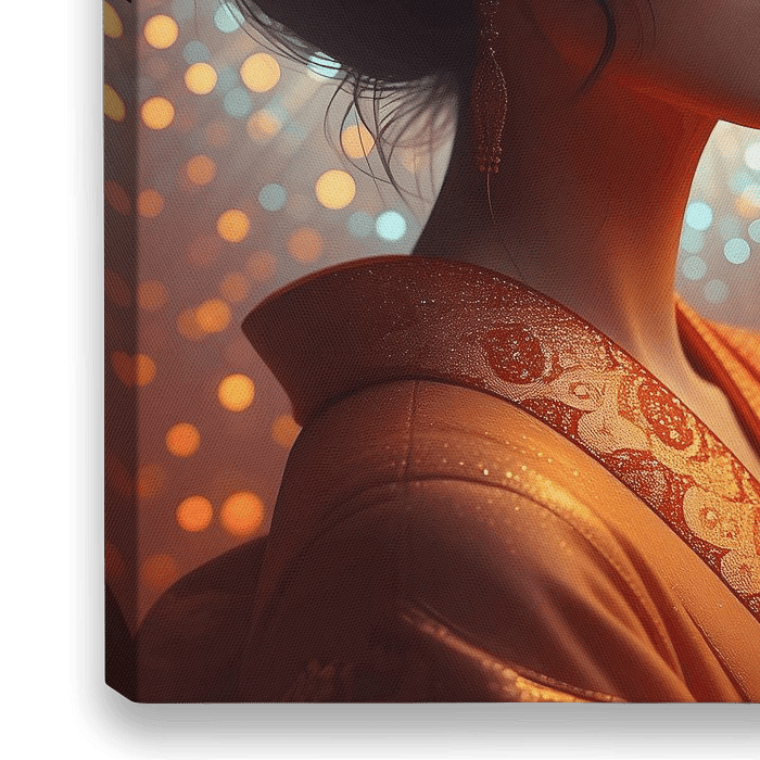 Dit betoverende portret in moderne kunststijl nodigt de toeschouwer uit tot een wereld waarin schoonheid en mysterie elkaar in evenwicht houden. Het kunstwerk toont een vrouwelijk figuur met een bijna onwerkelijke sereniteit: haar porseleinachtige huid licht op tegen een explosie van kleur, alsof ze zelf het stiltepunt vormt in een…