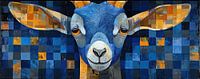 Geit Blauw - Op dit dieren schilderij zie je een grote blauwe geit met opvallende hoorns, tegen een achtergrond van verschillende blauwe en oranje vierkanten die een modern en abstract gevoel geven.