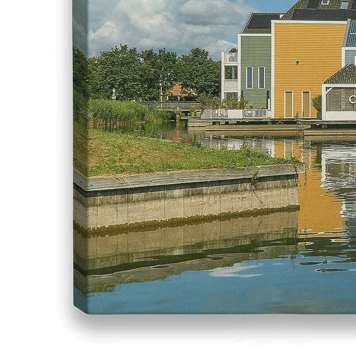 Op een mooie rustige zomerdag. Blauwe lucht met wolken maken de sfeer. De gekleurde huizen reflecteren in het water van de Rietplas te Houten.