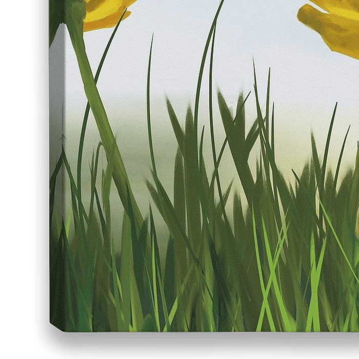 Schilderij van gele boterbloemen tussen groen gras op een wei. De lucht is blauw en helder, en een insect zit op een van de bloemen en geniet van de warmte op deze zomerse dag.