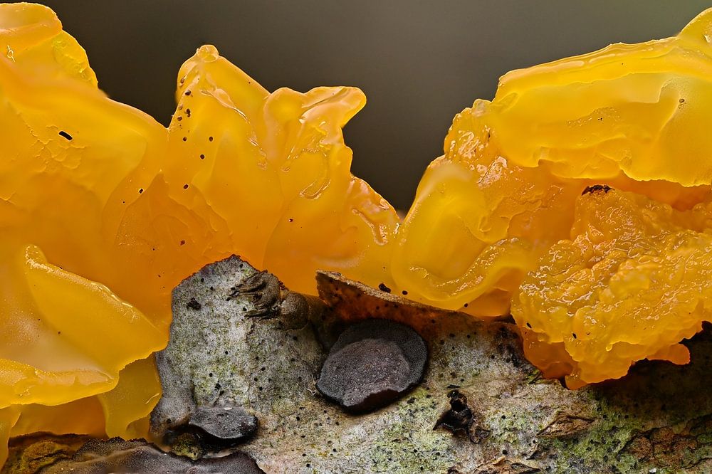 De foto toont de opvallend heldergele, gelei-achtige vruchtlichamenvan de zwam, die op een stuk dood hout groeien. De zwam heeft een glanzende, plooierige en doorschijnende structuur, die lijkt op gelatine of rubber. De ondergrond bestaat uit korstmos en donkere schimmellaagjes op bast, wat een mooi contrast vormt met de felle kleur van de trilzwam.