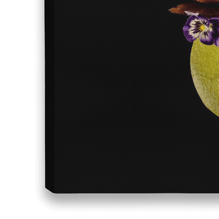 A beautiful, round, green yellow sweet macaron. The sweet treat is placed on a standard of bruin sticky caramel. The macaron is decorated with eatable purple flowers. Very nice for your empty wall, its sweet, colourful and artistic. Print this picture on high glossy material like dibond or acrylic and het shines at your wall. This picture is colourfull but also a very sharp photo. De background is deep black wich gives this image a luxery feeling emand touch.