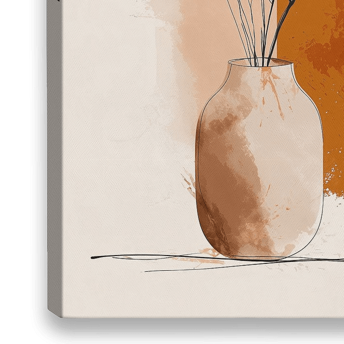 Dit illustratieve kunstwerk speelt meesterlijk met dualiteit: een serene witte vaas met minimalistisch getekenende stengels aan de ene kant, terwijl aan de andere kant explosief rode en oranjebruine waterverf-splatters de ruimte veroveren. Het werk balanceert tussen kontrole en chaos, elegantie en expressiviteit, en nodigt de kijker uit…