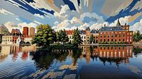 De lucht, opgebouwd uit abstracte en gelaagde wolkenpartijen, geeft een dramatisch en bijna futuristisch gevoel, terwijl de reflecties in het water het werk een gevoel van balans en symmetrie geven. De architectuur van de stad wordt tot leven gebracht door de opvallende kleuren en de harmonieuze lijnen, die de geschiedenis en moderniteit van Den Haag op unieke wijze samenbrengen.
