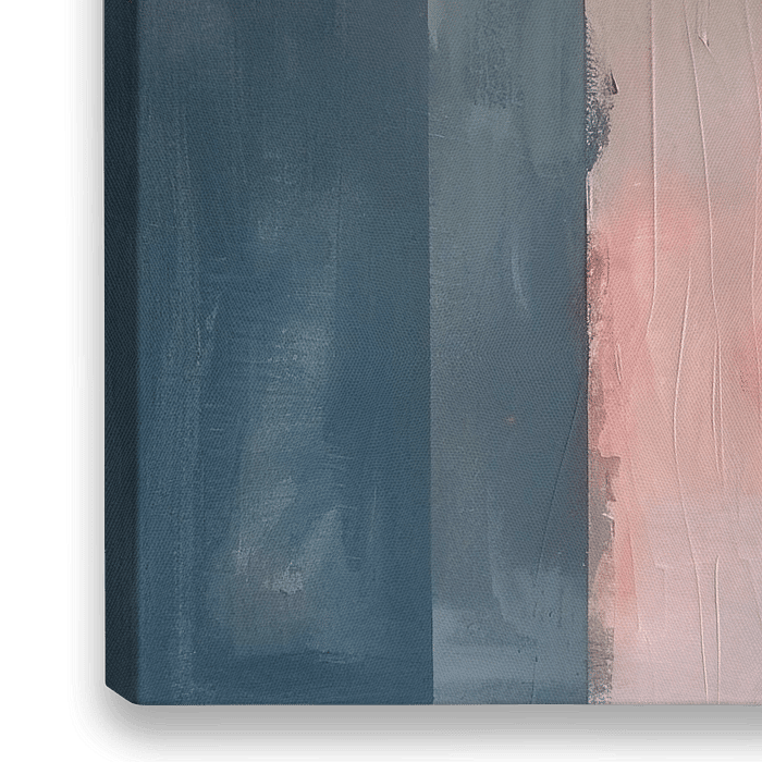 Geometrie - Dit abstracte schilderij kenmerkt zich door een harmonieuze mix van grote geometrische vormen in diverse kleuren, waaronder een prominente rozige terracotta boog naast rechte vlakken in diepblauw, lichtroze en ondoorzichtig wit, gelaagd met doorzichtige grijze en zwarte tinten die diepte toevoegen.
