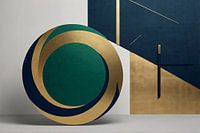 Dit unieke minimalistische ontwerp speelt met geometrische vormen en kleuren om een verfijnde, moderne uitstraling te creëren. De combinatie van een grote cirkel met strakke lijnen, afgewerkt in goud, groen, zwart en blauw, geeft het werk een luxe en tegelijkertijd eenvoudige uitstraling. Het gebruik van contrast tussen de zachte ronde…
