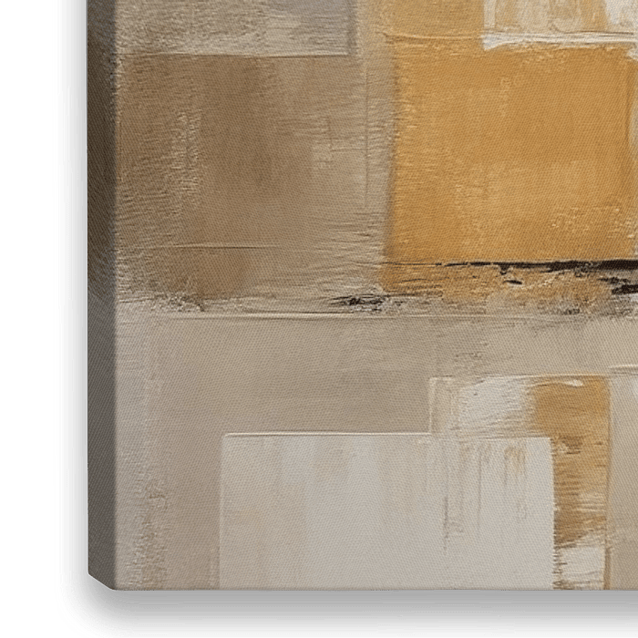 Geometrische Rust - Dit abstracte schilderij speelt met geometrische vormen in een zachte, doch expressieve compositie. De warme tinten geel, oker en grijze elementen vormen samen met wit een rustgevend palet. De textuur en verschillende lagen verf suggereren diepte en zorgen voor een boeiende dynamiek.