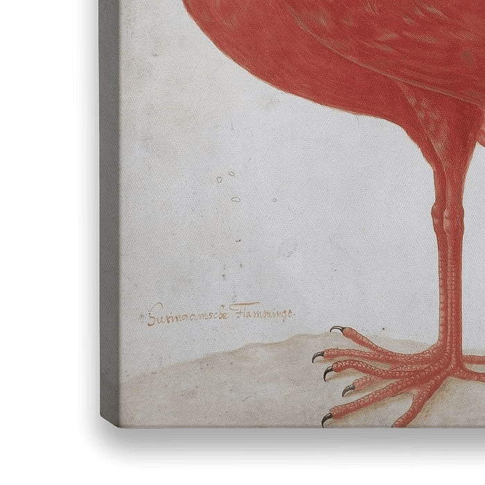 Surinaamse Flamingo's in oranje. Gespiegeld waardoor een nieuwe vorm ontstaat. Origineel in bezit van Rijksmuseum Amsterdam. Waarbij vermeld wordt dat het een afbeelding van een rode Ibis betreft in plaats van een Surinaamse Flamingo.