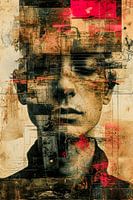 In deze foto wordt het gezicht van een jongeman verknipt door abstracte lijnen en stedelijke structuren. De indruk van verwarring en fragmentatie wordt versterkt door de contrasterende kleuren en vormen die op het gezicht zijn aangebracht. De intense rode en zwarte tinten geven de foto een krachtige, bijna rusteloze energie.