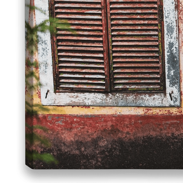 Verweerde gevel van een oud onbewoond huis met mysterieus gesloten luiken.