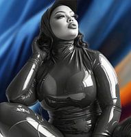 Deze afbeelding toont een plus-size model met sensuele, volle lippen die poseert in een glanzend, nauwsluitend latex body suit. De rondingen van het model worden benadrukt door het strakke pak, terwijl het reflecterende materiaal een glanzende en aantrekkelijke esthetiek toevoegt. De sensuele lippen van het model stralen zelfvertrouwen…
