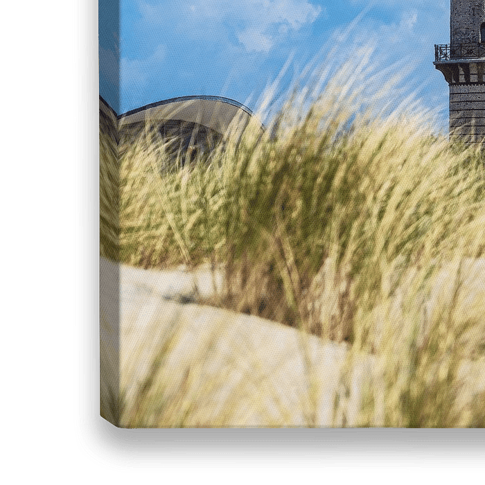 Koop de foto Gezicht op de vuurtoren met duin in Warnemünde van Rico Ködder op canvas, aluminium dibond, (ingelijste) fotoprint, behang en ArtFrame, op maat geprint in Fine-Art kwaliteit.