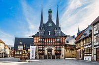 Gezicht op het marktplein en het stadhuis in Wernigerode.