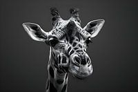 Op de zwart-wit close-up foto van een giraffe tegen een lichte achtergrond zijn de details van haar expressieve gezicht scherp en duidelijk. De grote, donkere ogen kijken nieuwsgierig en vriendelijk, omrand door lange, sierlijke wimpers die een zachte schaduw werpen. Haar vlekkenpatroon, variërend van lichtgrijs tot diepzwart, komt…