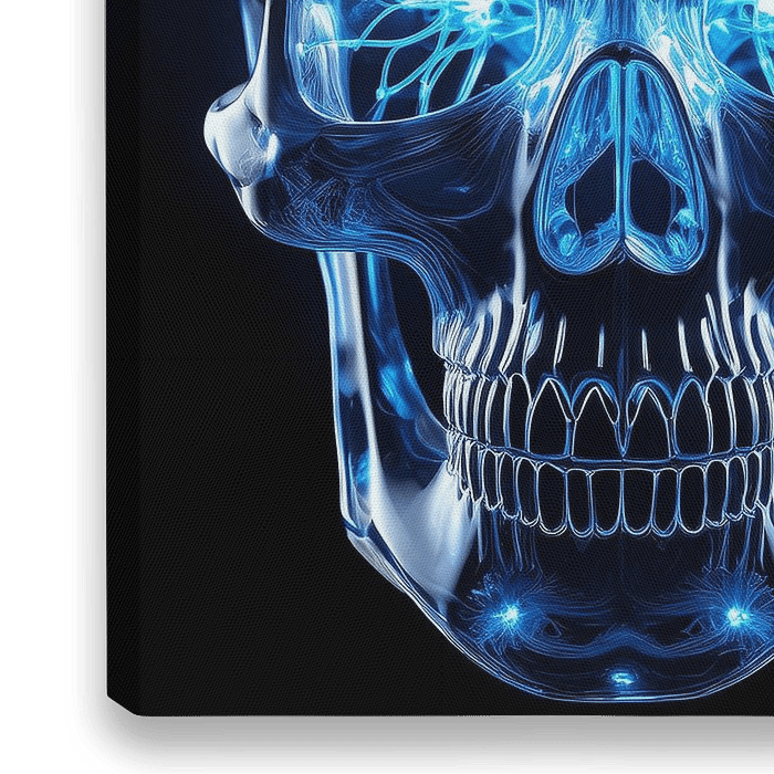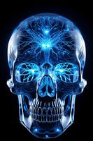 Transparante kristallen schedel met oplichtende blauwe synapsen tegen een zwarte achtergrond