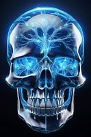 Transparante kristallen schedel met oplichtende blauwe synapsen tegen een zwarte achtergrond