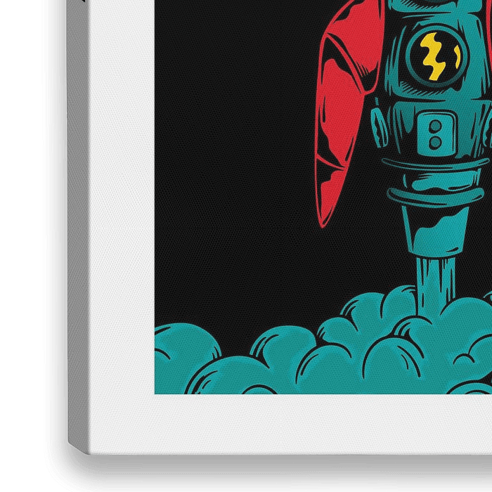 Retro afbeelding van een raket in de ruimte. Een tekening in cartoon-stijl. Wordt extra mooi met een zwarte lijst eromheen.