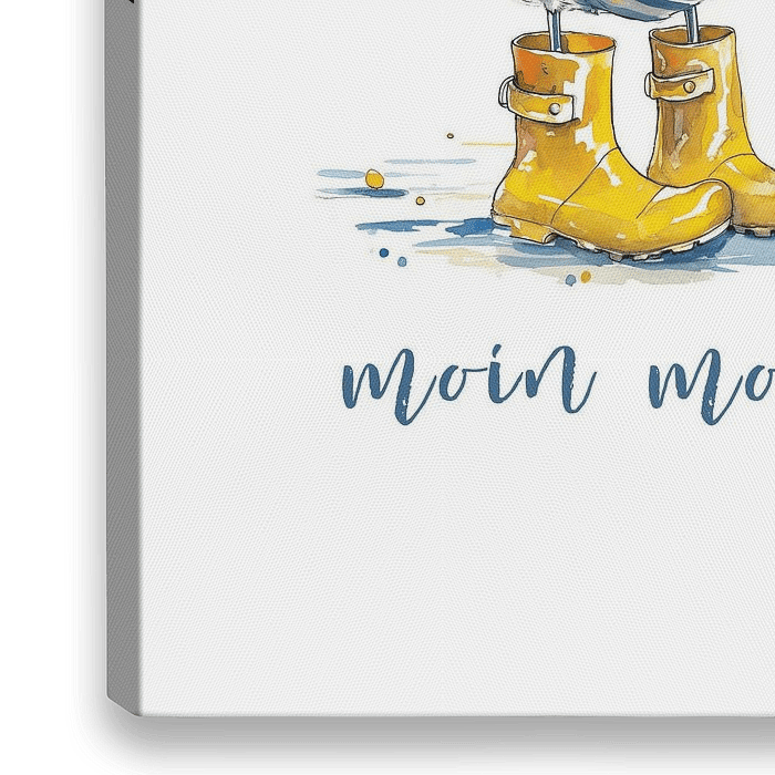 De illustratie toont een gestileerde zeemeeuw in een plas op een witte achtergrond. De zeemeeuw is levendig en gedetailleerd afgebeeld met een blauw-wit gestreept verenkleed, wat een frisse en maritieme uitstraling geeft. Onder haar ligt een plas waarin ze staat met felgele laarzen aan. De rubberen laarzen zijn zo groot dat ze bijna de…
