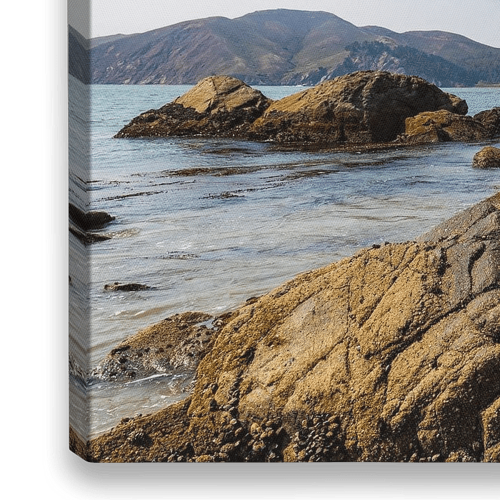 Vanaf een laag standpunt, kijkend over de rotsen op het strand aan de Grote Oceaan.