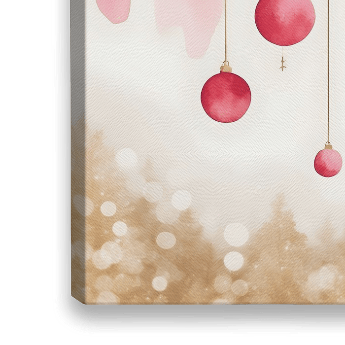 Laat je betoveren door de subtiele elegantie van Golden Blush Baubles – A Soft Pinkmas Glow, een minimalistische kerstcompositie waarin verfijning en zachtheid samenkomen. In deze aquarelachtige illustratie dansen transparante roze kerstballen sierlijk aan gouden linten, neerdalend vanuit een sluier van blushroze penseelstreken. De achtergrond is gehuld in een dromerige waas van goudglinsterende lichtjes en zachte boscontouren, die een warme, sfeervolle gloed creëren.