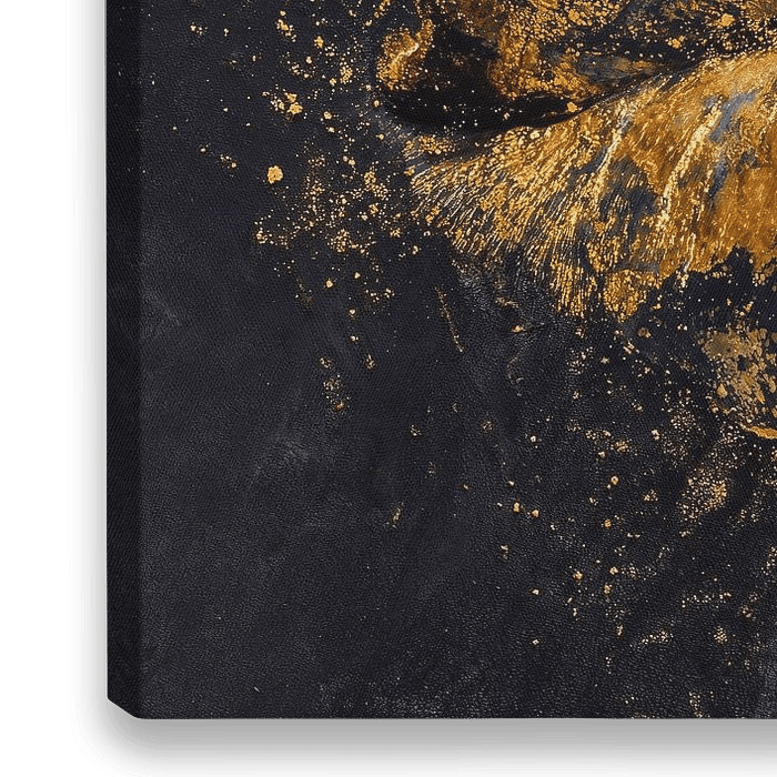 Een kunstwerk van lippen gedeeltelijk bedekt met glinsterende goud en zwarte verf. De goudverf is aangebracht met een textuur die bijna barstjes vertoont, de zwarte verf is spaarzamer aangebracht waardoor donkere accenten en schaduwen ontstaan. De belichting is dramatisch, werpt diepe schaduwen en benadrukt de metallic textuur van de…