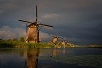 Deze foto is gemaakt bij werelderfgoed Kinderdijk (Zuid-Holland, Nederland). Heel de dag was het bewolkt en had het geregend, maar 's avonds trok de lucht mooi open. Dit leverde een fantastisch gouden uur (golden hour) op. Zeker in combinantie met de dreigende regenwolken op de achtergrond.