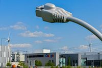 Het Google gebouw bij Groningen met de internetstekker op de voorgrond.