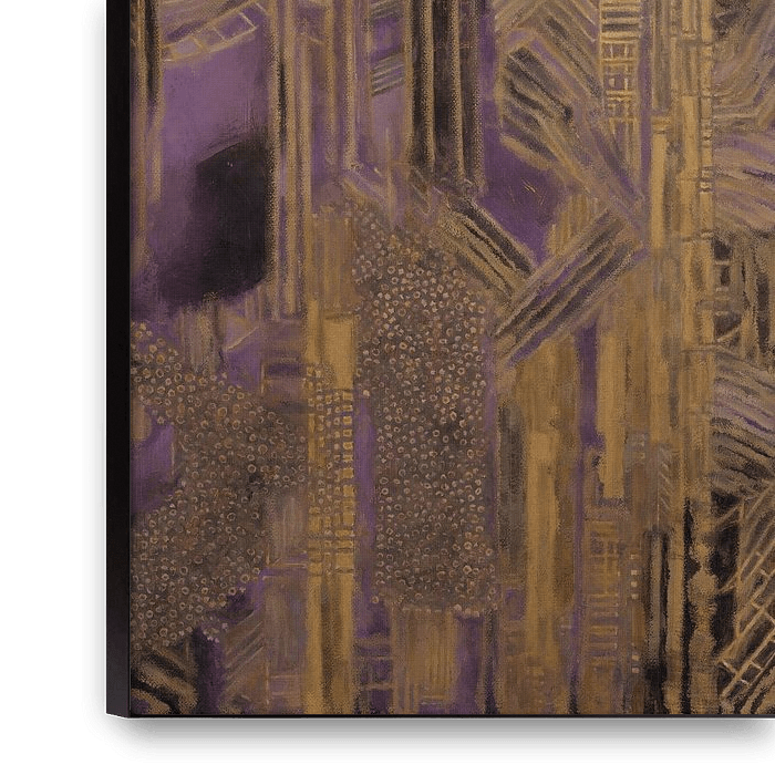 Dit werk toont een dynamische compositie van goud- en paarstinten, waarin verschillende geometrische vormen en lijnen samenkomen om een rijke, textuurlijke diepte te creëren. De gouden accenten contrasteren prachtig met de paarse achtergrond, wat een gevoel van luxe en elegantie oproept. De gelaagde structuren en patronen brengen een…