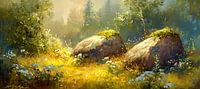 Gouden Bloemen en Stenen - Op dit landschap schilderij zie je twee grote stenen bedekt met groen mos, omringd door gele bloemen en een lichte, verwarmende gloed die een rustige, zonnige sfeer oproept.