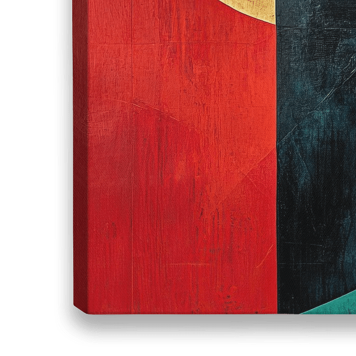 Gouden Cirkels | Dynamische Compositie in Goud en Blauw - Dit abstracte schilderij kenmerkt zich door dominante cirkelvormen en het gebruik van krachtige kleuren zoals goud, rood en blauw, die samen een dynamische en rijke compositie vormen.