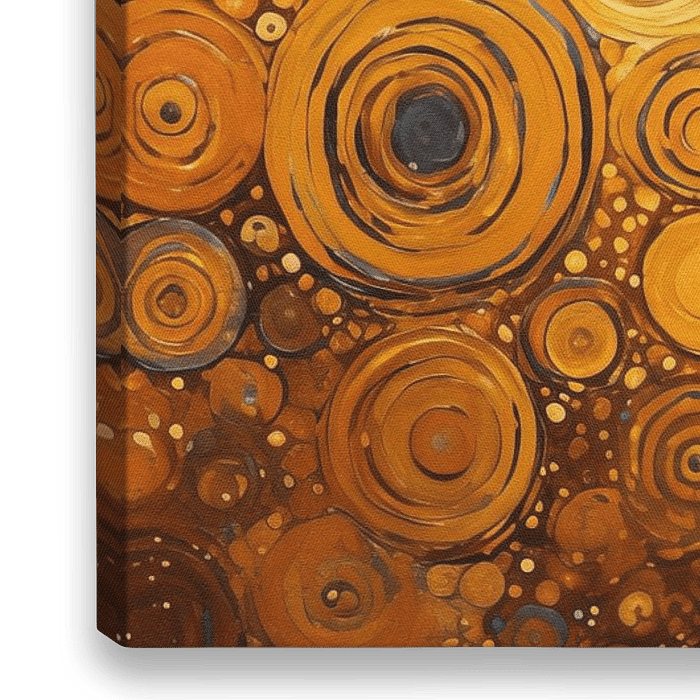Een kleurrijk digitaal schilderij met Gouden Cirkels in te stijl van Gustav Klimt. Dit werk is geïnspireerd door de vormen en het kleurenpallet van "De Kus". Het werk geeft een warme en klassieke uitstraling aan uw interieur!