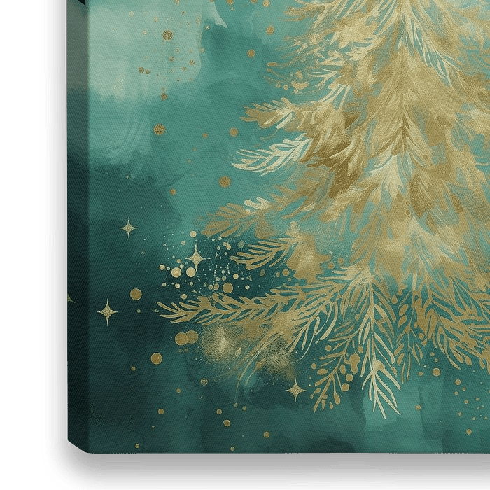 Kerst tafereel. Gouden kerstboom met gouden kerststerren luchtig weergegeven op een prachtige abstracte achtergrond in aquablauw en groentinten. Passend bij diverse stijlen en trends, waaronder kerst en winter.