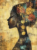 Gouden Oorbellen | Vrouw Goud - Dit is een vrouwen schilderij waarin een zijaanzicht van een donker profiel met grote ronde gouden oorbellen en bloemen in het haar centraal staat, uitgevoerd als modern abstract schilderij met geruwde textuur en ingetogen goud- en aardetinten — vrouwen schilderij, schilderij vrouw, abstract…