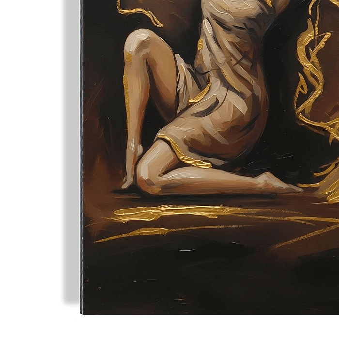 Dit schilderij straalt een zinnelijke en dromerige sfeer uit, waarin de vrouwelijke vorm centraal staat. Het kunstwerk is geschilderd in een expressieve, bijna impressionistische stijl, met krachtige penseelstreken en een dynamische opbouw. De kunstenaar werkt met een rijk palet van warme aardetinten – diepe bruin- en sepiakleuren – die worden doorbroken door levendige gouden accenten. Deze gouden lijnen slingeren sierlijk rondom de figuur en geven het werk een bijna magische, etherische uitstraling.
