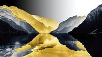 Deze artistieke compositie toont kalm water dat gouden bergen weerspiegelt onder een dramatisch contrasterende hemel, waardoor een etherisch en vredig landschap ontstaat. De bergtoppen, badend in warme gouden tinten, worden perfect weerspiegeld in het stille meer, wat het gevoel van harmonie en rust versterkt. De lucht, dramatisch…