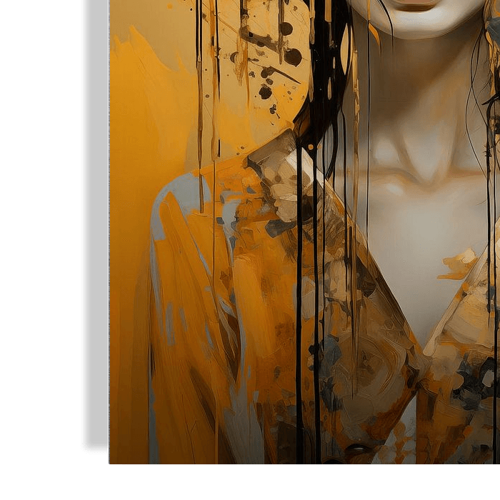Prachtig mixed media portret van een krachtige vrouw. Met zwarte opgestoken haren en gekleed in een kimono. Het portret is verfraaid met cirkels en vlakken in de stijl van Gustav Klimt. Een ware blikvanger voor in uw grote hal, mooie woonkamer of zelfs voor in de slaapkamer. De kleurcombinatie van goud, oranje, beige en zwart zorgt voor een warme uitstraling.