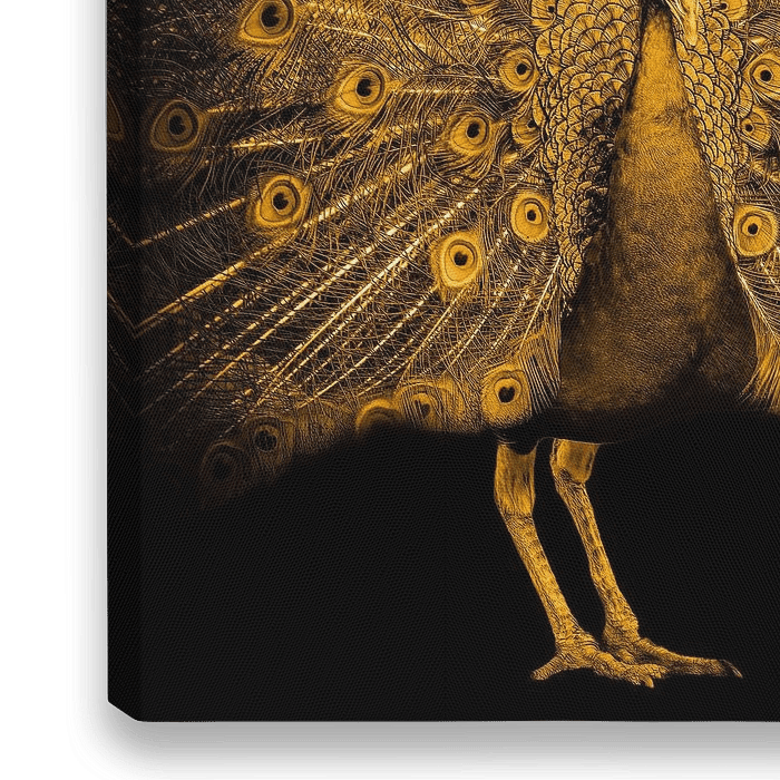 Portret van een mooie trotse pauw digitaal bewerkt met zwarte achtergrond en goudkleur.