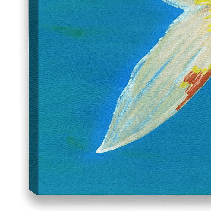 Een acryl inkt tekening van een gevlekte komeetstaart goudvis. Het is een oranje gevlekte goudvis, Hij zwemt schuin omhoog. Hij zwemt in turquoise blauw water.