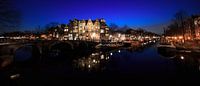 Panorama van de verlichte grachtenpanden en de Brouwersgracht en Prinsengracht met reflectie in het water tijdens het blauwe uur aan het begin van de nacht in Amsterdam, de hoofdstad van Nederland.