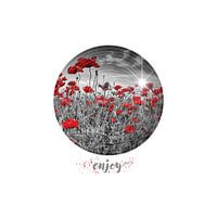 Prachtige zomerbloemenweide met klaprozen en zon. De scène is teruggebracht tot de hoofdactie in een ronde geometrische vorm. Minimalistische afbeelding in zwart-wit met rode bloemen en de tekst: enjoy (Veel plezier)! Bevrijdend en motiverend motief in de pure natuur.