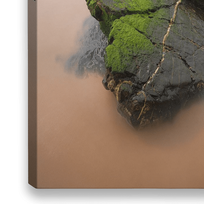 Rotsen met groen mos op de voorgrond aan de kust van de Atlantische Oceaan in de regio Alentejo. Gefotografeerd met een lange sluitertijd.