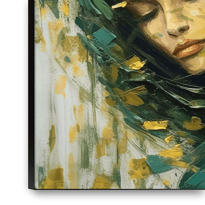 Dit schilderij vangt de essentie van een vrouwengezicht in een spel van grove, expressieve penseelstreken. Het gezicht lijkt gevormd te zijn door de krachtige bewegingen van de kunstenaar, waarbij de contouren en kenmerken van de vrouw subtiel tevoorschijn komen te midden van een zee van grove groene tinten.