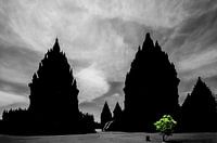 Hindu tempel Prambanan vlakbij Yogyakarta, zwartwit opname met tegenlicht waardoor het tempelcomplex als silhouet zich aftekend, op de voorgrondeen alleenstaande boom die nog mooi groen is..